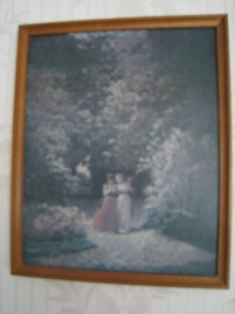 Reprodukcja obrazu przedstawiająca dwie kobiety w długich, powiewających sukniach idące razem ścieżką w parku lub ...